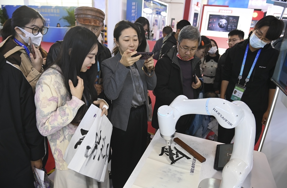 參觀者在首屆中國國際供應(yīng)鏈促進(jìn)博覽會數(shù)字科技鏈展區(qū)科大訊飛展位觀看一款A(yù)I書法機(jī)器人寫毛筆字(2023年12月2日攝)。新華社記者 蔡湘鑫 攝