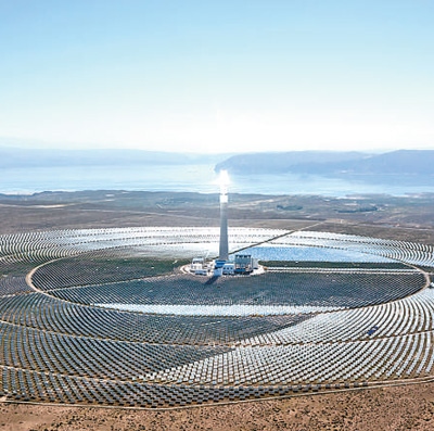 青海海南藏族自治州,太陽能生態(tài)發(fā)電園區(qū)內(nèi)的50兆瓦熔鹽塔式光熱電站。本報(bào)記者 伊 霄攝