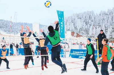 在重慶市豐都區(qū)南天湖冰雪旅游季川渝雪地氣排球邀請(qǐng)賽上,選手在激烈比拼。楊 森攝