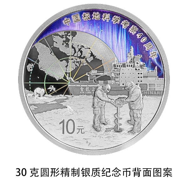 30克圓形銀質(zhì)紀(jì)念幣背面圖案為“雪龍2”號極地考察船、中國極地考察隊冰芯取樣工作場景、北極熊,輔以局部北極地圖輪廓及中國2座北極考察站點位、極光等組合設(shè)計,并刊“中國極地科學(xué)考察40周年”字樣及面額。