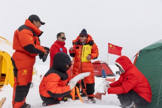 姚檀棟(站立左二)、湯普森(站立左三)在海拔6100米的普若崗日冰原冰穹C作業(yè)點查看冰芯。新華社記者姜帆 攝