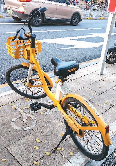 廣東深圳福田區(qū)福中路上,一輛共享單車停放于專門劃定的還車點內(nèi)。本報記者 盧澤華攝