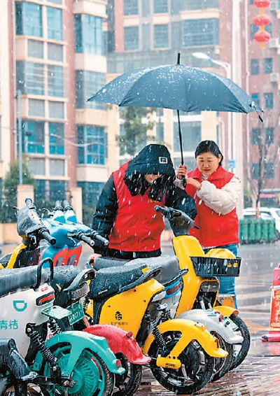 江西省贛州市興國縣長征社區(qū)志愿者在網(wǎng)格區(qū)整理共享單車。陳鵬攝(人民視覺)