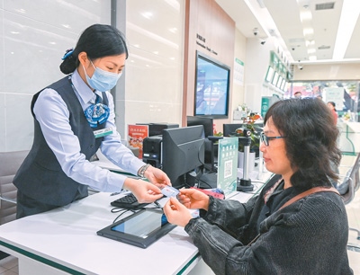“社保服務(wù)事項(xiàng)進(jìn)銀行”是重慶市社會(huì)保險(xiǎn)局創(chuàng)新推出的一項(xiàng)公益服務(wù),合作銀行通過所有人工服務(wù)網(wǎng)點(diǎn)、智能自助服務(wù)終端以及手機(jī)銀行App,向群眾免費(fèi)提供社保服務(wù)。圖為中國農(nóng)業(yè)銀行重慶沙坪壩天星橋支行,工作人員為市民辦理相關(guān)社保業(yè)務(wù)。孫凱芳攝(人民視覺)