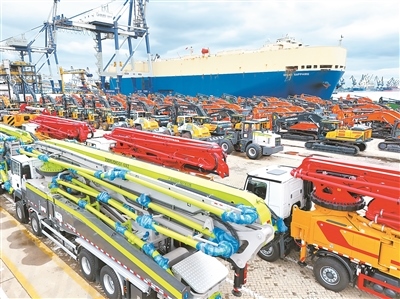 10月14日,國產(chǎn)工程機械在山東港口煙臺港集結(jié)等待裝船出口。唐 克攝(人民視覺)