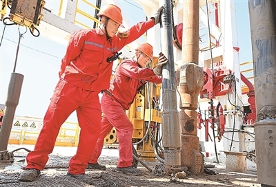 在山東省東營(yíng)市勝利油田利斜856鉆井現(xiàn)場(chǎng),勝利石油工程公司渤海50691鉆井隊(duì)員工進(jìn)行起下鉆施工,加快石油勘探開發(fā)步伐。王國(guó)章攝(人民視覺(jué))