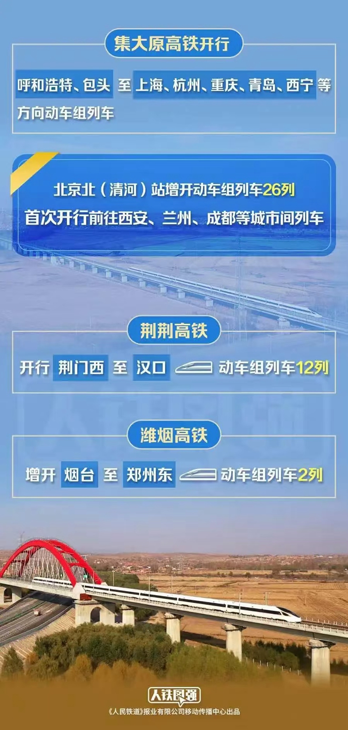 另一方面,鐵路部門(mén)用好集大原、荊荊高鐵等新線運(yùn)能,調(diào)整中西部高鐵運(yùn)行圖,服務(wù)中部地區(qū)崛起和西部大開(kāi)發(fā)。集大原高鐵開(kāi)通,內(nèi)蒙古自治區(qū)深度融入全國(guó)高鐵網(wǎng),開(kāi)行呼和浩特、包頭至上海、杭州、重慶、青島、西寧等方向動(dòng)車(chē)組列車(chē),旅行時(shí)間大幅壓縮;北京北(清河)站增開(kāi)動(dòng)車(chē)組列車(chē)26列,首次開(kāi)行前往西安、蘭州、成都等城市列車(chē),加強(qiáng)首都與中西部城市間交流。