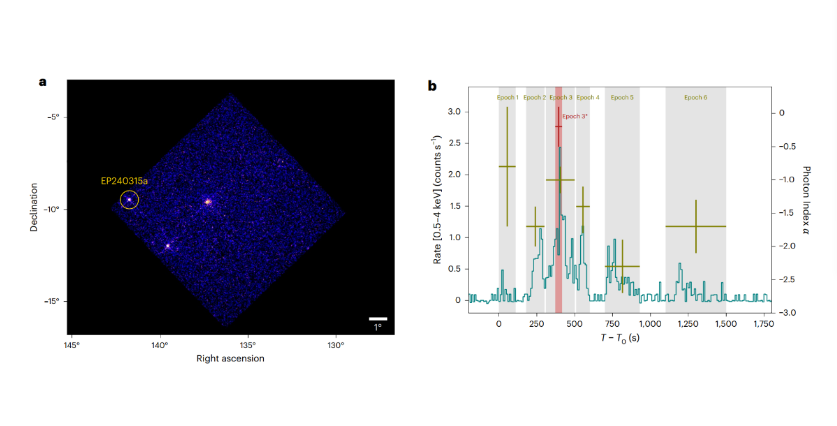 “天關(guān)”衛(wèi)星探測到的EP240315a的軟X射線圖像和光變曲線。(中國科學院國家天文臺供圖)