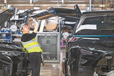 在位于湖北武漢經(jīng)開(kāi)區(qū)的嵐圖汽車(chē)數(shù)字化總裝車(chē)間,工人在流水線上作業(yè)。