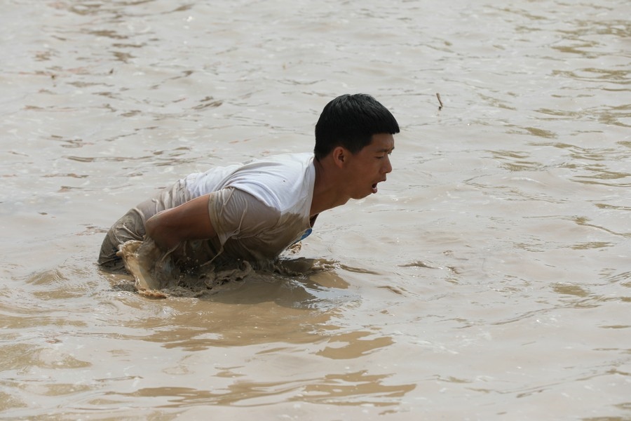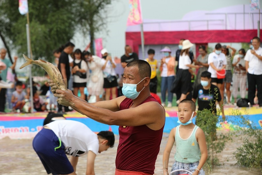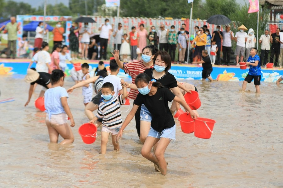 隨著主持人的一聲號令,來自呼和浩特市區(qū)和土默特左旗的眾多參與者,挽起褲管,光著腳丫,沖進(jìn)池塘,展開了一場摸魚大比拼。
