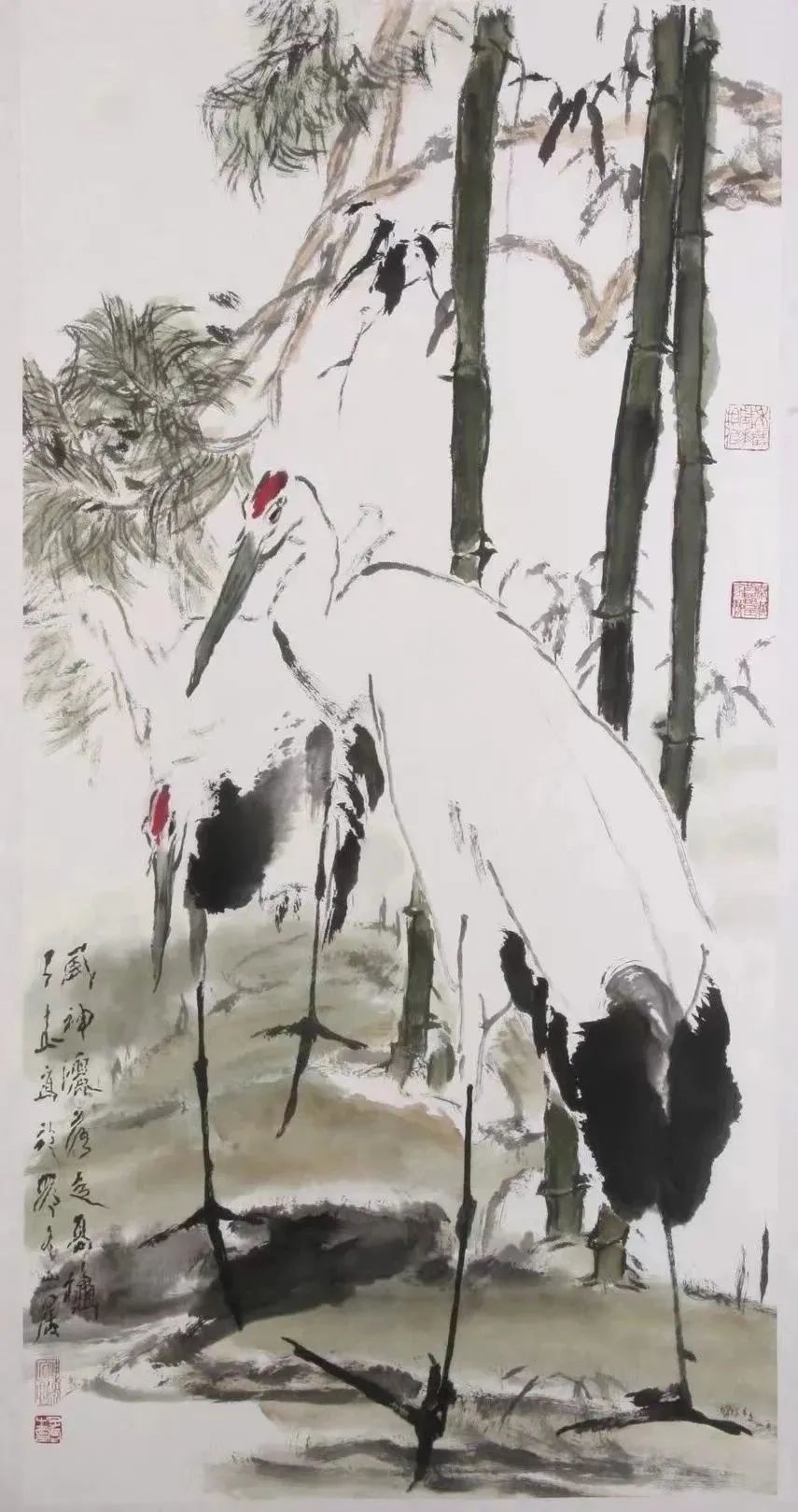 仙鶴是王子武鐘愛的動物題材?!讹L(fēng)神灑落占高秋》是王子武晚年畫仙鶴喜歡使用的畫作名稱?!坝鹨砉饷髌鄯e雪,風(fēng)神灑落占高秋?!背鲎蕴拼嵐鹊脑姟耳Q》,形容仙鶴高潔,寄托了詩人高逸瀟灑的情懷。