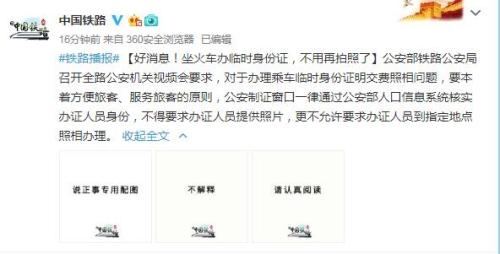 4月19日,《新華每日電訊》刊登《辦臨時身份證坐火車,非得拍照證明自己是自己?》引起社會廣泛關(guān)注。公安部鐵路公安局有關(guān)負責人回應稱,已要求所有辦證單位和人員不得再要求辦證人員提供照片。