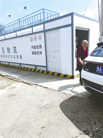 6月29日16時許,記者來到回民區(qū)塞外安康新居小區(qū)。該小區(qū)旁邊是一處老舊廠區(qū)。記者開車進入這個老舊廠區(qū)看到,在大門的左手邊有一臺撬裝式加注裝置。這時,一名中年婦女告訴記者,加油往里走,這臺裝置壞了。隨后,記者開車又往廠區(qū)院里走了約50米,在路的右側有一臺撬裝式加注裝置,這臺裝置距離塞外安康新居小區(qū)的居民樓很近(如圖二)。記者把車停在加注裝置旁邊,一位老人熟練地打開車的油箱蓋,問記者加多少錢的油。加油過程中,老人告訴記者,“這個撬裝式加注裝置是向安監(jiān)部門申請的,供單位內部用油?!庇浾咴儐枺骸凹热皇枪﹩挝粌炔渴褂茫菍ν饧佑筒慌卤徊??”老人說:“執(zhí)法部門查不查,那是老板的事兒。因為油便宜,來這里加油的人不少。”這里92號汽油每升為4.3元。