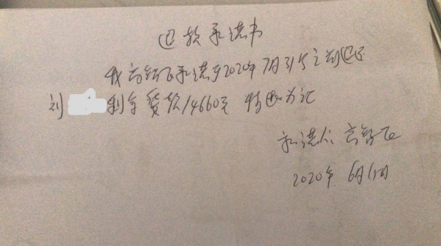 為了不耽誤婚房裝修,劉先生又在居然之家選擇了其他品牌的衛(wèi)浴,并向高經(jīng)理提出退回未付貨的14660元貨款。但高經(jīng)理表示最近手里沒錢,不過(guò),他答應(yīng)劉先生,在7月31日前會(huì)全部退還,并且當(dāng)場(chǎng)寫了一個(gè)退款承諾書。