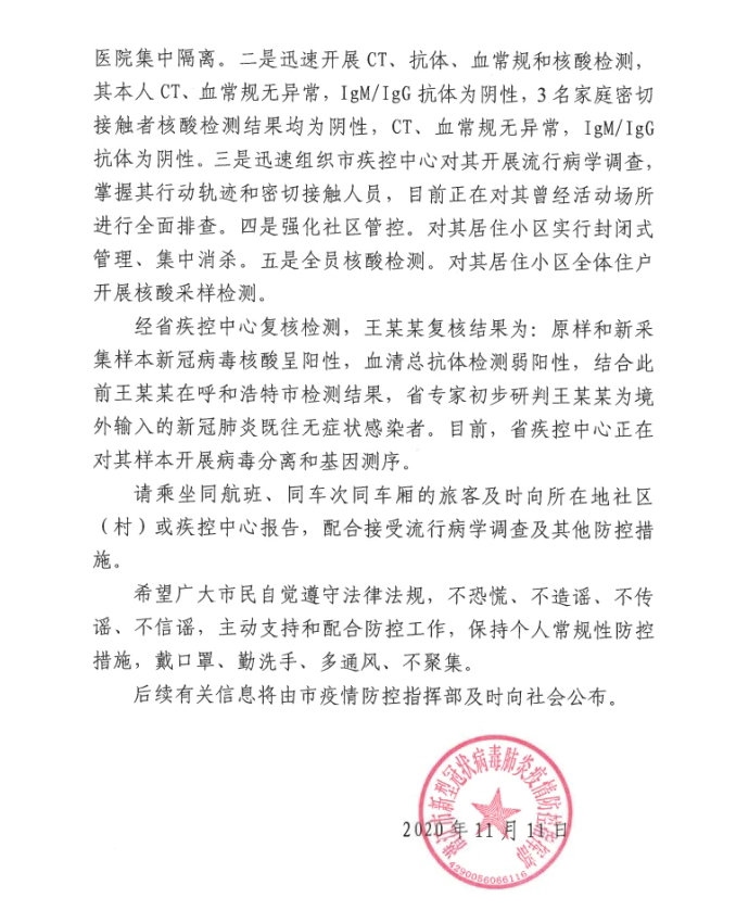 11月10日王某在潛江市核酸檢測結果陽性。為切實保障廣大市民身體健康,呼和浩特市疫情防控指揮部已對王某離呼前的密切接觸者和密切接觸者的密切接觸者全部落實了管控措施,后續(xù)工作按照相關要求正在有序進行中。