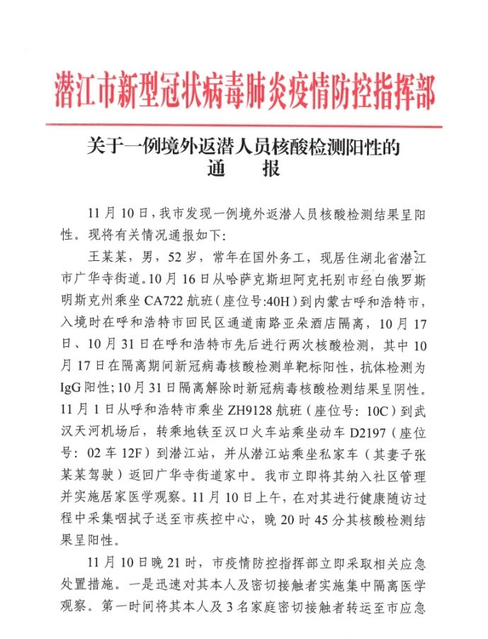 王某某,男,52歲,常年在國外務工,現(xiàn)居住湖北省潛江市廣華寺辦事處。2020年10月16日從哈薩克斯坦阿克托別市經(jīng)白俄羅斯明斯克州乘坐CA722航班(座位號:40H)到內(nèi)蒙古呼和浩特市,入境時在呼和浩特市回民區(qū)通道南路亞朵酒店隔離,10月17日、10月31日在呼和浩特先后進行兩次核酸檢測,其中10月17日在隔離期間新冠病毒核酸檢測單靶標陽性,抗體檢測為LgG陽性;10月31日隔離解除時新冠病毒核酸檢測陰性。11月1日從呼和浩特市乘坐ZH9128航班(座位號:10C)到武漢天河機場后,轉乘地鐵至漢口火車站乘坐動車D2197(座位號:02車12F)到潛江,從潛江乘坐私家車(其妻子張某某駕駛)返回廣華家中,并落實社區(qū)管控措施。11月10日,其咽拭子送至潛江市疾控中心核酸檢測結果呈陽性。