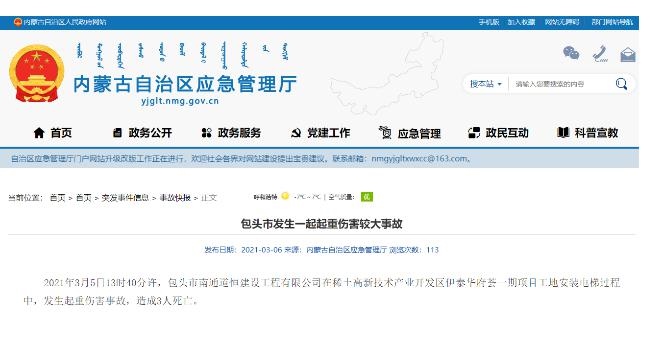 北疆新聞網、北疆新聞客戶端消息(記者 李艷紅)記者從內蒙古自治區(qū)應急管理廳獲悉,3月5日13時40分許,包頭市南通道恒建設工程有限公司在稀土高新技術產業(yè)開發(fā)區(qū)伊泰華府薈一期項目工地安裝電梯過程中,發(fā)生一起重傷害事故,造成3人死亡。據了解,死亡原因可能為員工操作不當造成。