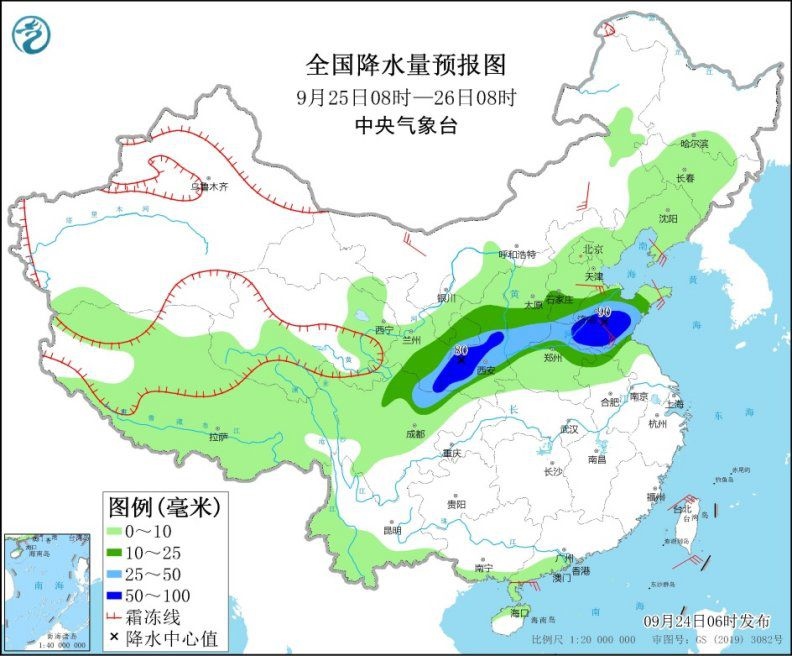 9月24日08時(shí)至25日08時(shí),西北地區(qū)東部、華北大部、黃淮中北部、海南島等地部分地區(qū)有中到大雨,其中,陜西中南部、華北南部、山東西部、河南北部、海南島東南部等地部分地區(qū)有暴雨或大暴雨(100~140毫米)。新疆南疆盆地等地部分地區(qū)有4~6級風(fēng),新疆東部部分地區(qū)有8~9級風(fēng)。