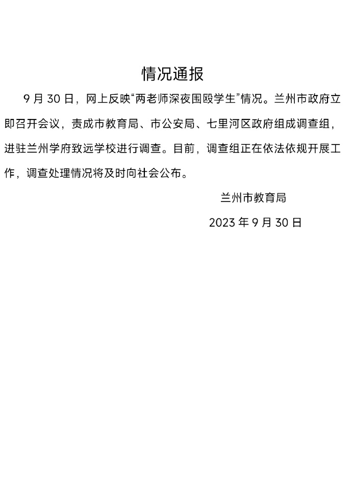 蘭州教育局通報(bào)網(wǎng)傳“兩老師圍毆學(xué)生”:多部門組成調(diào)查組進(jìn)駐 9月30日,網(wǎng)上反映“兩老師深夜圍毆學(xué)生”情況。蘭州市......