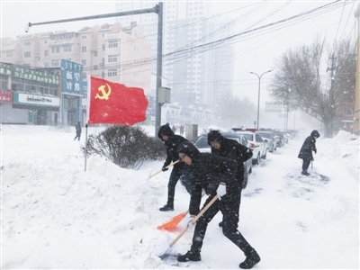 下雪期間,明仁街道再次啟動應(yīng)急除雪預(yù)案,街居干部和除雪機(jī)械全部到崗,小區(qū)物業(yè)、沿街商戶、居民群眾也被發(fā)動起來,除雪大隊化整為零,分赴重點(diǎn)片區(qū)和社區(qū),從早上7點(diǎn)到夜幕沉沉,不分晝夜迎戰(zhàn)風(fēng)雪。