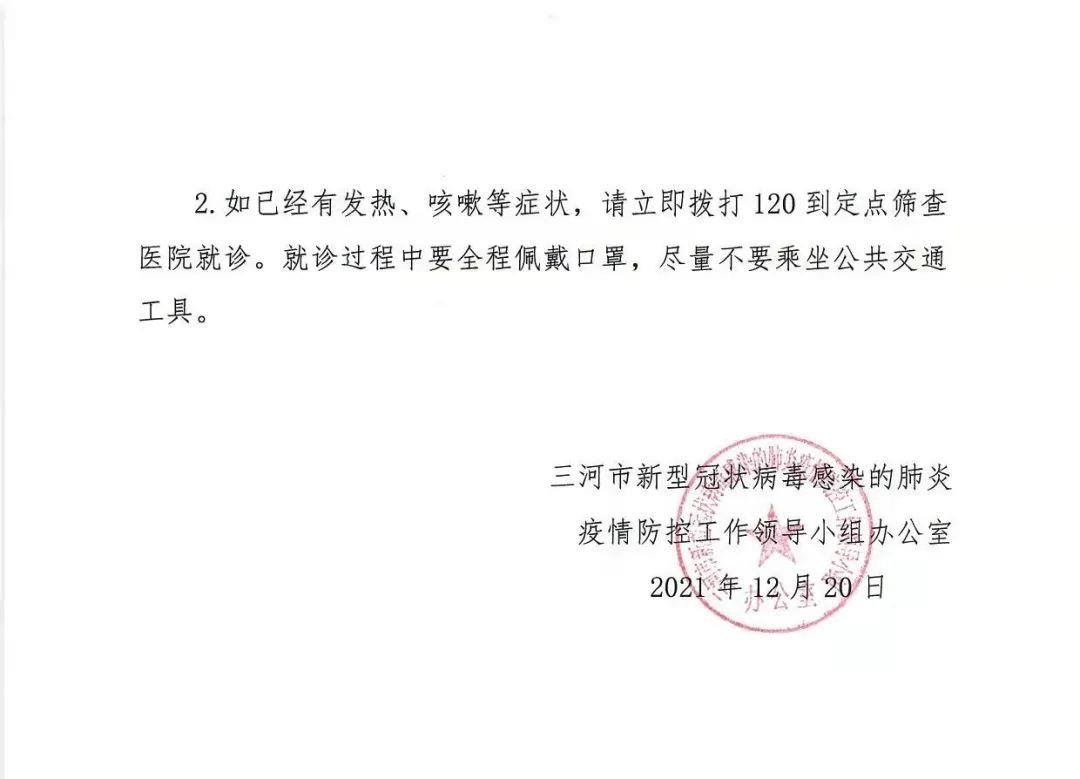 中新網(wǎng)12月20日電 據(jù)河北三河市網(wǎng)信辦官方微信消息,三河市新冠肺炎疫情防控工作領(lǐng)導小組辦公室今日發(fā)布公告,通報1例北京確診病例密接者行動軌跡。