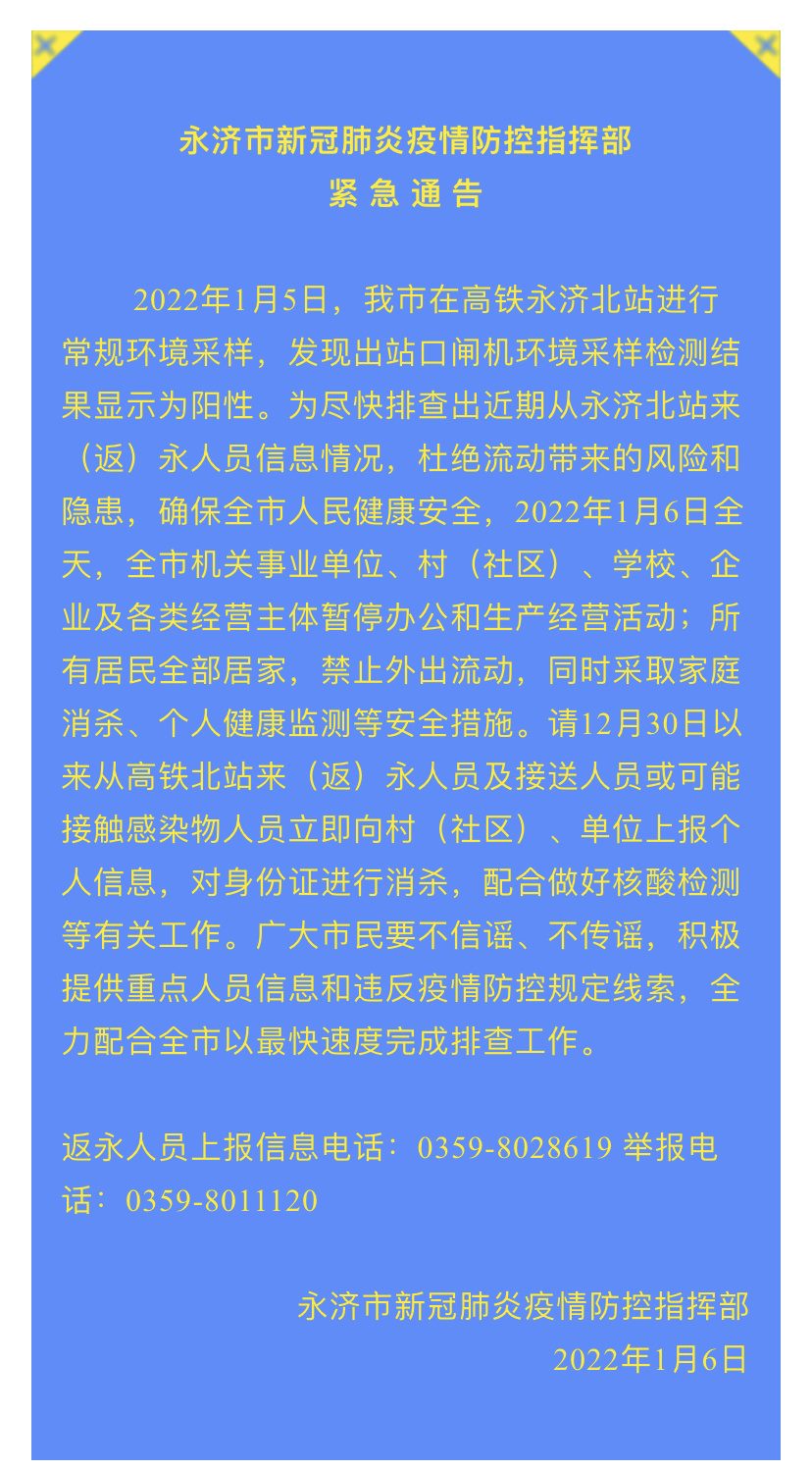 2022年1月5日,山西省永濟市在高鐵永濟北站進行常規(guī)環(huán)境采樣,發(fā)現(xiàn)出站口閘機環(huán)境采樣檢測結果顯示為陽性。為盡快排查出近期從永濟北站來(返)永人員信息情況,杜絕流動帶來的風險和隱患,確保全市人民健康安全,1月6日全天,全市機關事業(yè)單位、村(社區(qū))、學校、企業(yè)及各類經(jīng)營主體暫停辦公和生產(chǎn)經(jīng)營活動;所有居民全部居家,禁止外出流動,同時采取家庭消殺、個人健康監(jiān)測等安全措施。請12月30日以來從高鐵北站來(返)永人員及接送人員或可能接觸感染物人員立即向村(社區(qū))、單位上報個人信息,對身份證進行消殺,配合做好核酸檢測等有關工作。廣大市民要不信謠、不傳謠,積極提供重點人員信息和違反疫情防控規(guī)定線索,全力配合全市以最快速度完成排查工作。