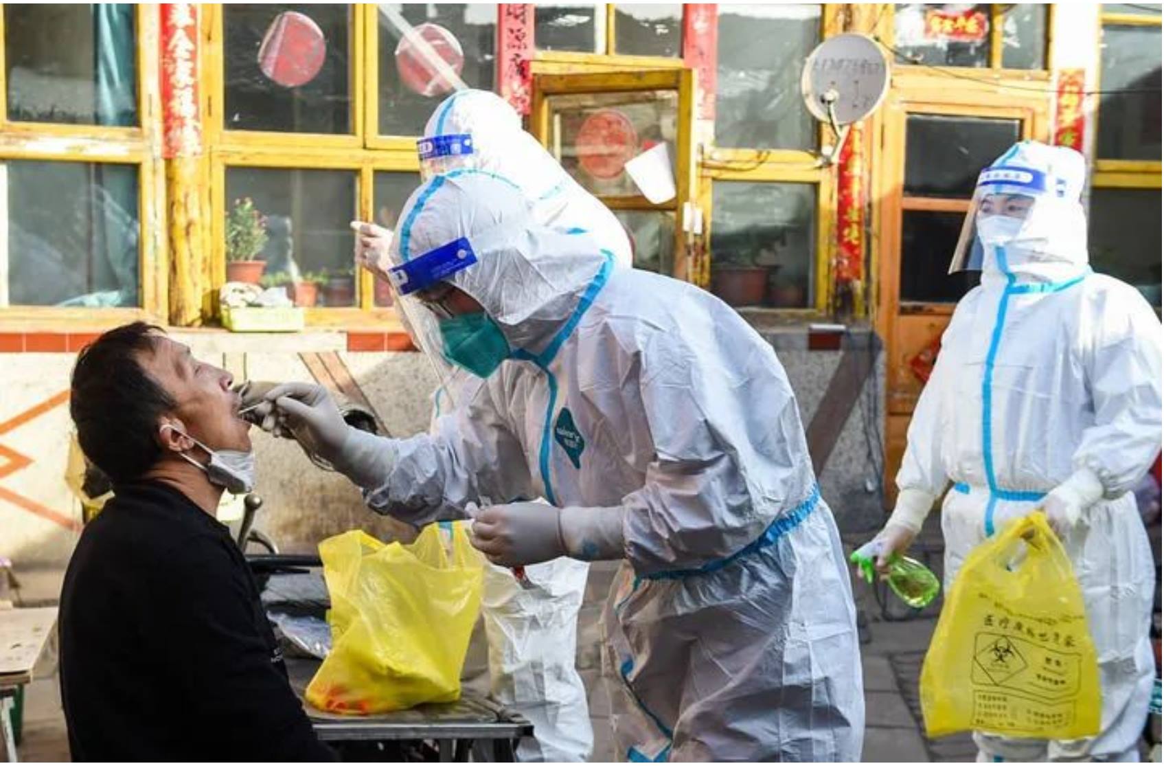 ↑3月6日,在呼和浩特市賽罕區(qū)東瓦窯社區(qū),網(wǎng)格員(右一)輔助醫(yī)務(wù)工作者為次密接群眾上門(mén)做核酸檢測(cè)。