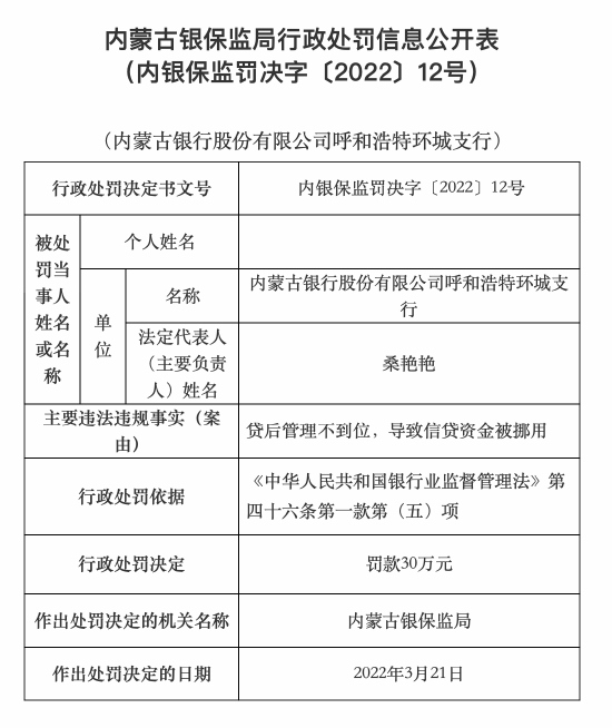 4月28日消息,據(jù)內(nèi)蒙古銀保監(jiān)局行政處罰信息公開表顯示,內(nèi)蒙古銀行股份有限公司呼和浩特環(huán)城支行因貸后管理不到位導致信貸資金被挪,被罰款30萬元。具體內(nèi)容如下: