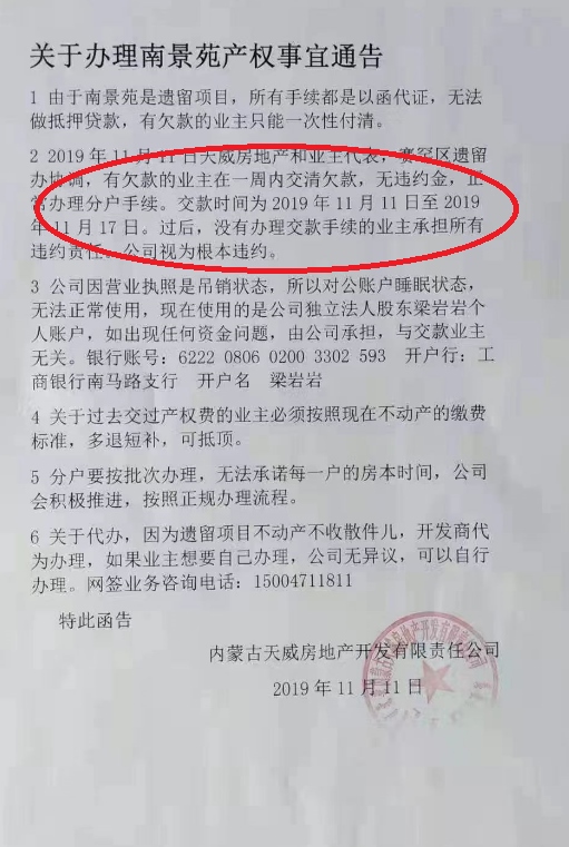 對于賈麗娟的說法,南景苑小區(qū)的居民告訴記者:“2019年11月11日,天威房地產(chǎn)公司曾在小區(qū)張貼過一則關(guān)于辦理南景苑產(chǎn)權(quán)事宜通告,公告中已經(jīng)明確,2019年11月11日天威房地產(chǎn)和業(yè)主代表、賽罕區(qū)遺留辦協(xié)調(diào),有欠款的業(yè)主在一周內(nèi)交清欠款,無違約金,正常辦理分戶手續(xù)。這充分說明了我們不需要在交納違約金暨滯納金,賈麗娟所說的滯納金明顯與當(dāng)年的通告內(nèi)容相違背。再說,天威房地產(chǎn)公司營業(yè)執(zhí)照處于吊銷狀態(tài),好多地方存在違約行為,按合同約定公司應(yīng)該賠償給居民的錢誰來負(fù)責(zé)?”(北方新報(bào)正北方網(wǎng)首席記者 高志華 實(shí)習(xí)生 張子椒)