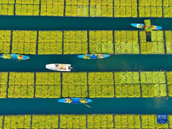 近年來,浙江省杭州市淳安縣在千島湖典型庫灣、入湖口等區(qū)域,積極運(yùn)用生態(tài)浮島水上植物無土栽培技術(shù)種植空心菜、水芹菜等水生蔬菜,直接吸收庫區(qū)水體中氮磷等元素,從而能夠有效地降低水體中營養(yǎng)物質(zhì)的含量,提升水質(zhì)。近日,水生蔬菜進(jìn)入采收季節(jié),“湖上菜園”呈現(xiàn)春收繁忙景象。