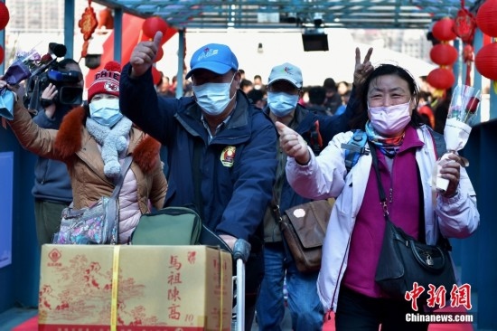 2月19日,搭載59名旅客的“吉順9號(hào)”客輪緩緩駛?cè)敫V葸B江黃岐客運(yùn)碼頭,標(biāo)志著連江黃岐至馬祖白沙“小三通”客運(yùn)航線(xiàn)復(fù)航。此前,廈門(mén)-金門(mén)客運(yùn)航線(xiàn)、福州馬尾-馬祖客運(yùn)航線(xiàn)、泉州-金門(mén)客運(yùn)航線(xiàn)已相繼復(fù)航。圖為兩岸鄉(xiāng)親在黃岐客運(yùn)碼頭激動(dòng)相擁。中新社記者 張斌 攝