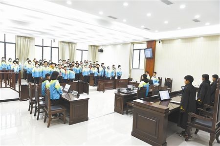 伴隨著“小法官”手中的法槌落下,一場(chǎng)庭審體驗(yàn)活動(dòng)正式開始。在法庭干警的指導(dǎo)下,8名學(xué)生“一秒入戲”,從宣讀法庭紀(jì)律、核對(duì)當(dāng)事人身份,到法庭調(diào)查、舉證質(zhì)證、法庭辯論,整個(gè)庭審程序嚴(yán)謹(jǐn)規(guī)范、秩序井然。