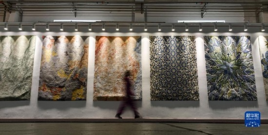 2月21日,在西寧市圣源地毯集團(tuán)有限公司生產(chǎn)車間,一名操作工走過(guò)藏毯展示區(qū)。