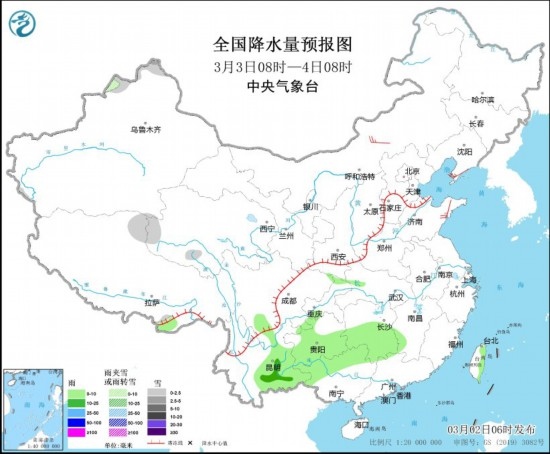 3月3日08時(shí)至4日08時(shí),新疆北疆北部、青海南部和西部等地部分地區(qū)有小到中雪或雨夾雪。湖南中南部、貴州中南部、云南中東部、廣西北部等地部分地區(qū)有小到中雨。內(nèi)蒙古中部、遼東半島、山東半島等地部分地區(qū)有4~5級(jí)風(fēng)。臺(tái)灣海峽、巴士海峽、南海東北部和西南部海域有5~7級(jí)風(fēng),陣風(fēng)8級(jí)。