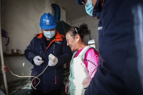 郭家供電所員工在“盲人大院”叮囑盲人居民安全使用插排。(新華社記者 潘昱龍攝)