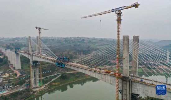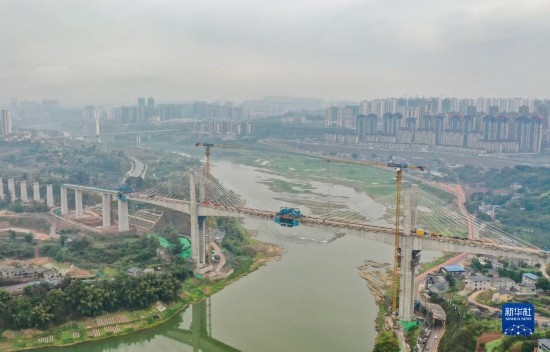 3月18日在四川省瀘州市拍攝的渝昆高鐵瀘州沱江特大橋主跨合龍施工現(xiàn)場(chǎng)(無(wú)人機(jī)照片)。