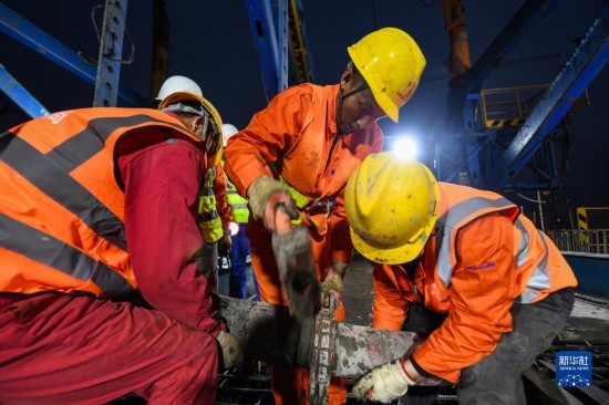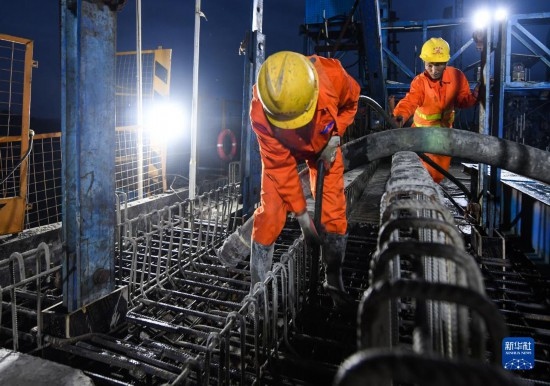 3月18日,在位于四川省瀘州市的渝昆高鐵瀘州沱江特大橋主跨合龍施工現(xiàn)場(chǎng),施工人員在安裝混凝土運(yùn)輸管道。