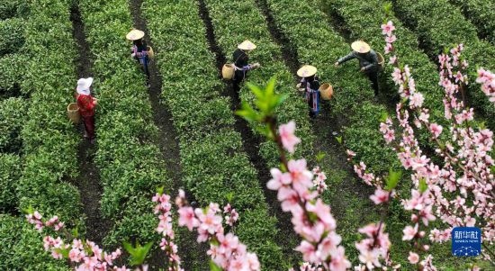 3月20日,在湖南衡陽常寧市塔山瑤族鄉(xiāng),技術(shù)人員在茶園指導(dǎo)茶農(nóng)采茶(無人機照片)。