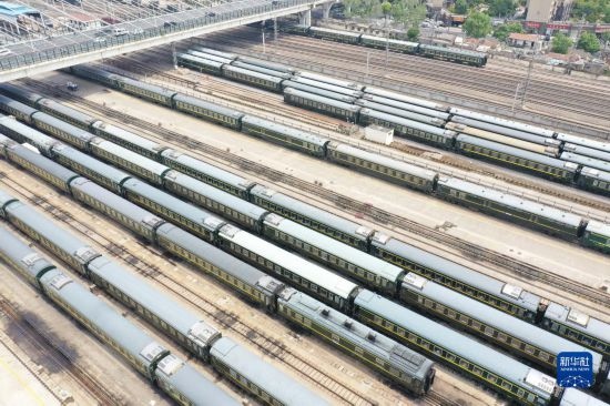 4月28日拍攝的中國鐵路上海局集團有限公司徐州站客車整備場內(nèi)的臨時旅客列車(無人機照片)。