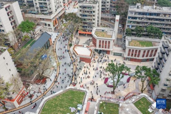 4月28日,在竣工亮相的重慶市九龍坡區(qū)謝家灣街道民主村片區(qū)城市更新項目(一期),人們在一處公共空間休息(無人機照片)。