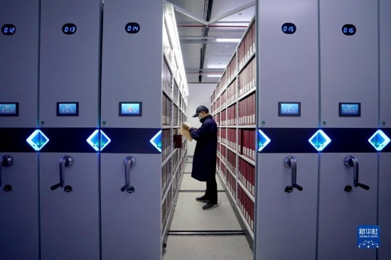 4月28日,在上海市檔案館的庫房內(nèi),保管部工作人員杜新慶在智能密集架間提取檔案。
