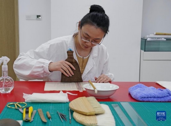 4月28日,在上海市檔案館的保護技術部,檔案修復師任翹楚利用專業(yè)設備對檔案進行展平處理。