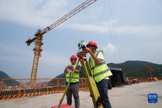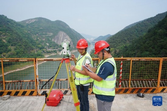 5月4日,在重慶市北碚區(qū)渝武高速復(fù)線觀音峽嘉陵江特大橋,中交一公局四公司橋梁工區(qū)工作人員孫培耕(右)和彭昭屏在對橋面高程及軸線偏位進(jìn)行測量。