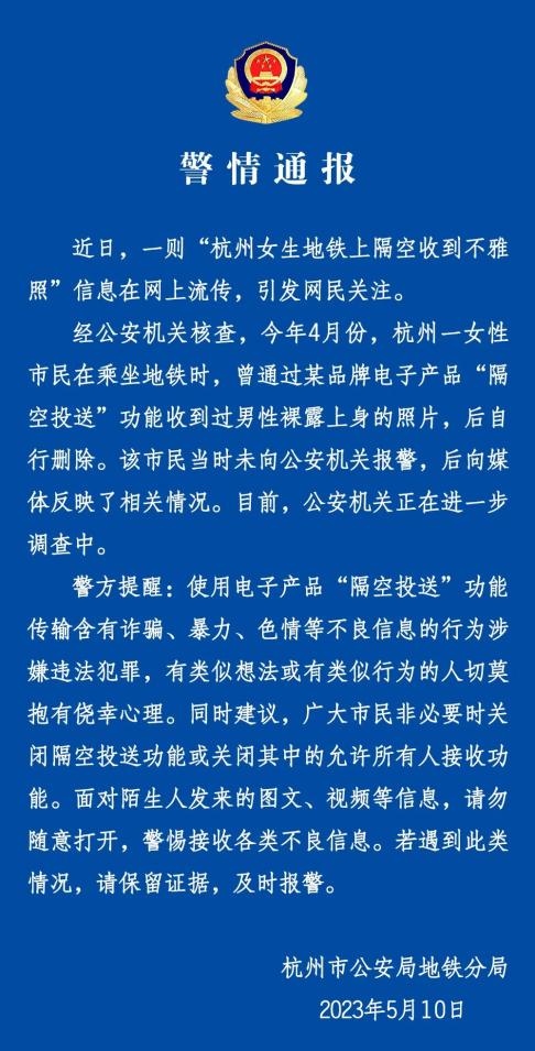 ·杭州一女子地鐵上隔空收到不雅照,警方回應(yīng):正在進(jìn)一步調(diào)查。