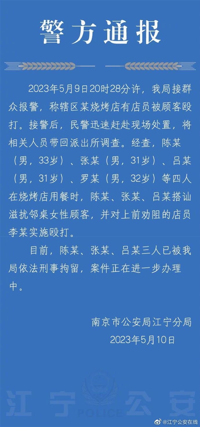 ·南京警方:三男子搭訕滋擾鄰桌女顧客并毆打勸阻店員,已刑拘。