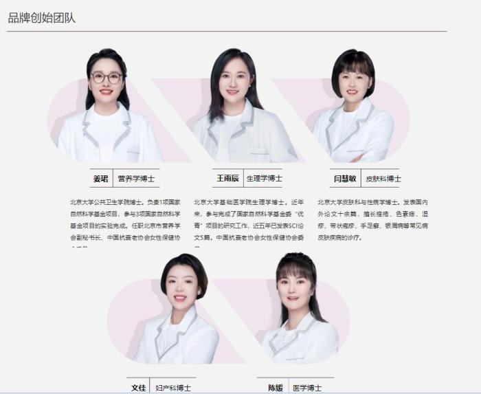 “五個女博士”官網信息則宣傳,該品牌成立于2019年7月,由來自北京大學的五個醫(yī)學女博士聯(lián)合創(chuàng)立,官網首頁還放上了五人的簡介。其主要產品包括膠原蛋白肽維c飲品、每日亢唐植物飲品等。