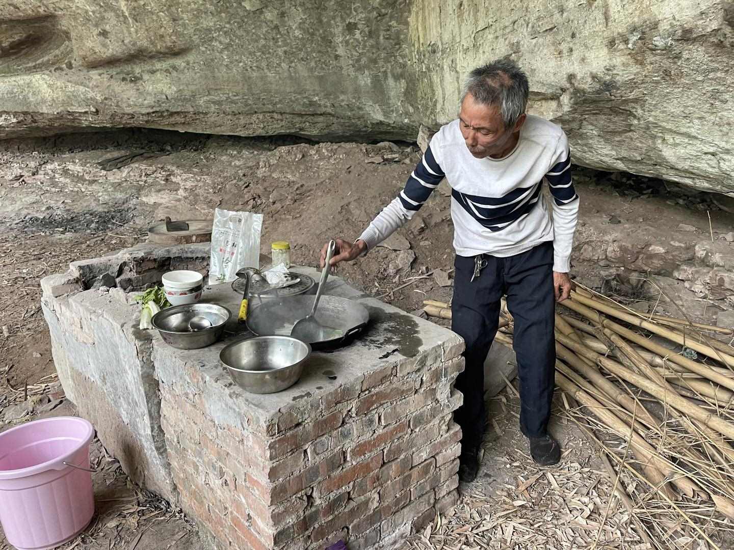 4月12日11時(shí)左右,紅星新聞?dòng)浾咴诋?dāng)?shù)卮迕駧ьI(lǐng)下探訪了馮必全居住的“大巖洞”。當(dāng)時(shí)馮必全已在洞里煮好稀飯,正在煮厚皮菜。紅星新聞?dòng)浾呖吹?,馮必全炒菜時(shí)沒(méi)有油,直接把煮熟的厚皮菜倒進(jìn)鍋里加鹽翻炒。他說(shuō)自己最近都這樣吃,因?yàn)闆](méi)錢買油。