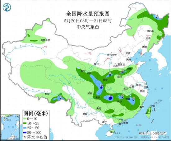 全國降水量預報圖(5月20日08時-21日08時)。圖片來源:中央氣象臺網(wǎng)站