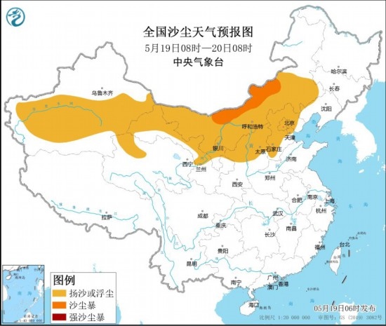 全國沙塵天氣預報圖(5月19日08時-20日08時)。圖片來源:中央氣象臺網(wǎng)站