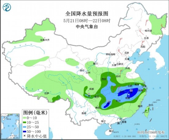 全國降水量預報圖(5月21日08時-22日08時)。圖片來源:中央氣象臺網(wǎng)站